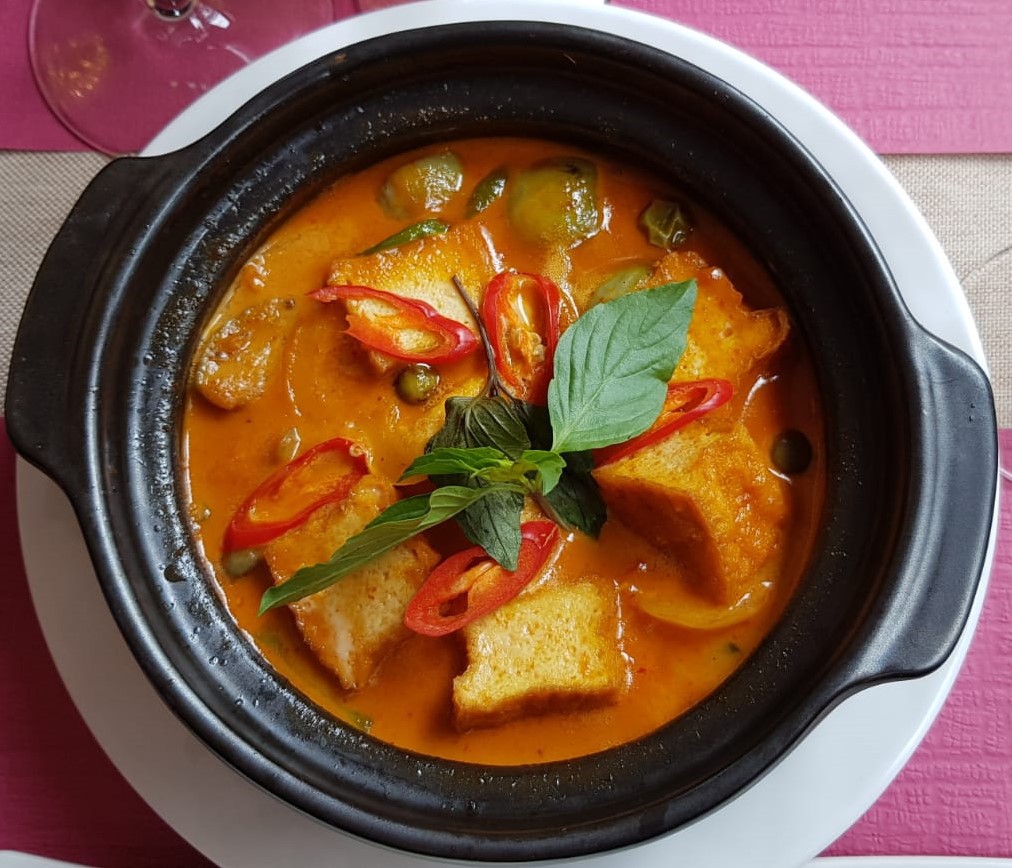 - Au curry vert,aubergines thaï,lait de coco et basilic.
